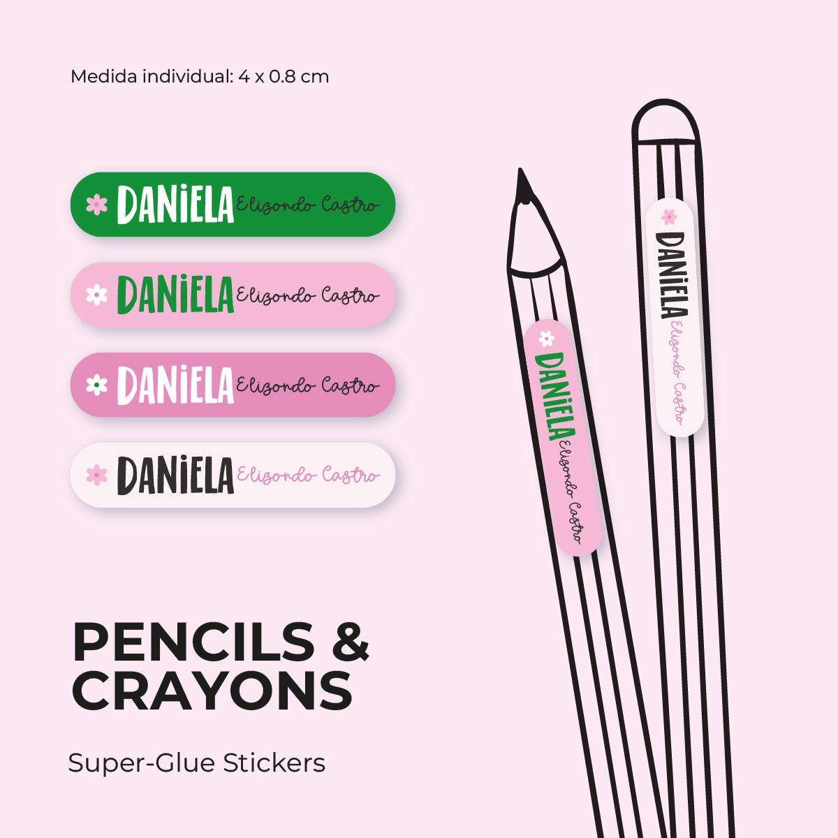 ¡Les llamamos Super-Glue Stickers! Porque en serio, ¡se pegan muchísimo! Funcionan excelente en crayolas, plumones, lápices y marcadores.