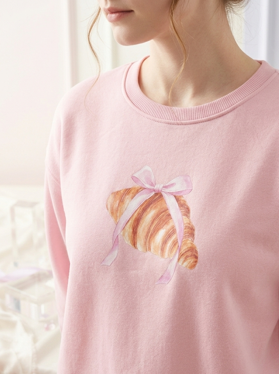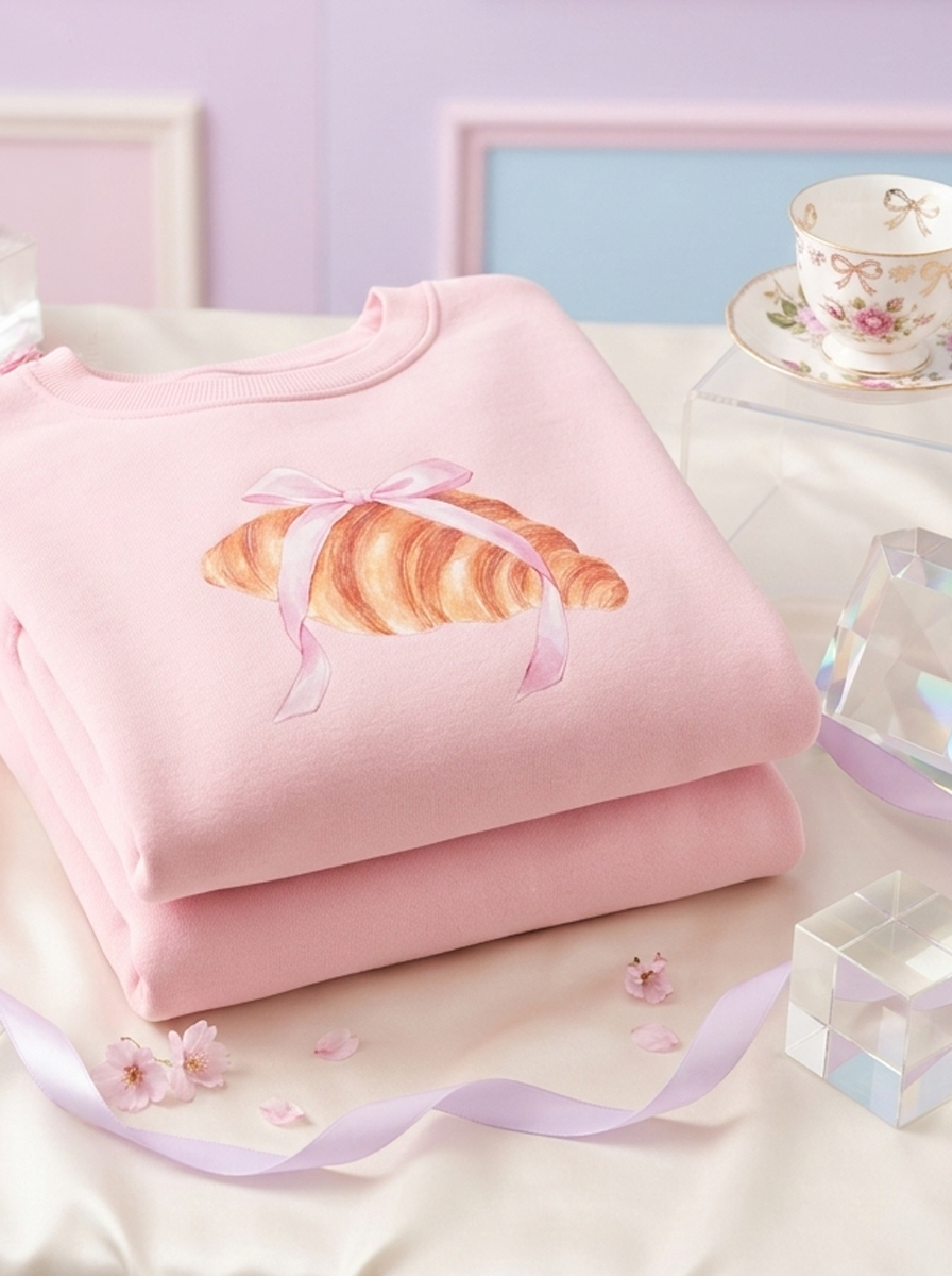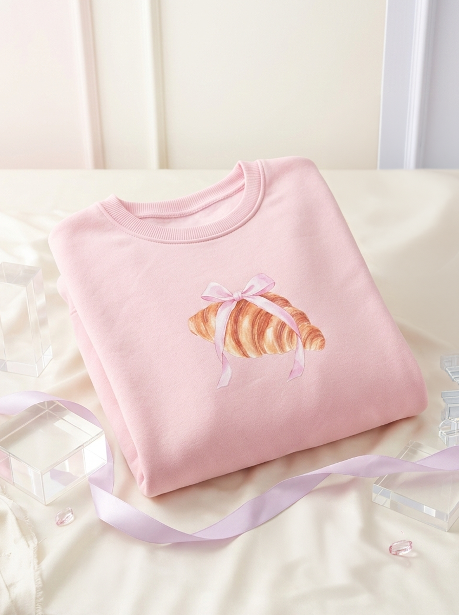 Esta sudadera en tono rosa presenta la ilustración de un croissant con moño, combinando dulzura y elegancia en una pieza cómoda que puedes usar todo el año.