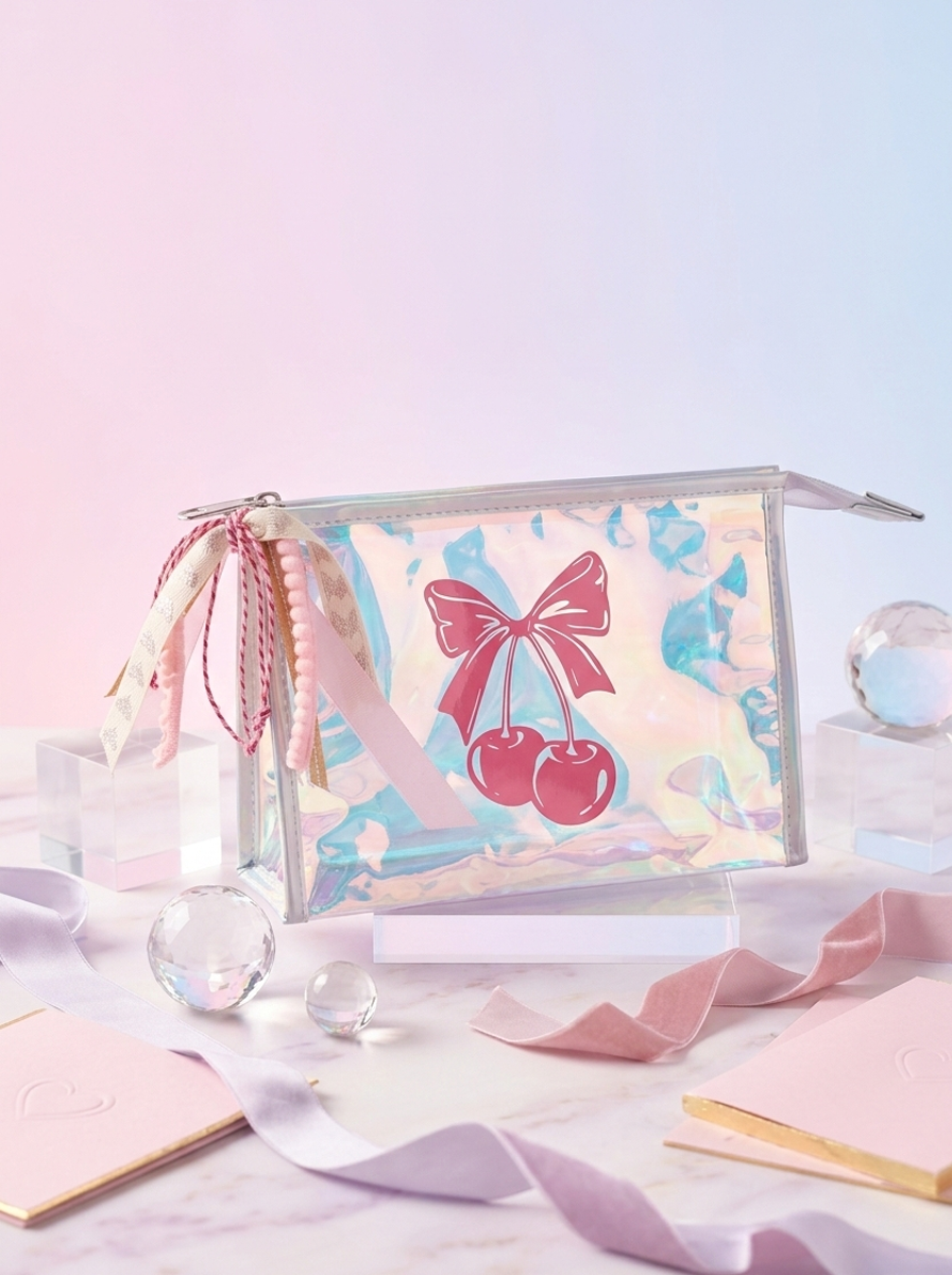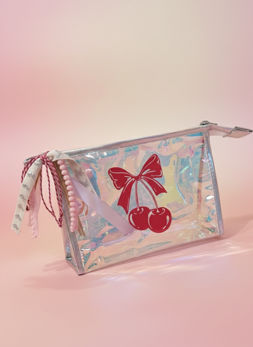Esta lapicera holográfica con diseño de cerezas y moño es el complemento perfecto para llevar tus plumas, marcadores o básicos diarios con estilo. Su acabado iridiscente cambia sutilmente con la luz, haciendo que cada ángulo se vea diferente.