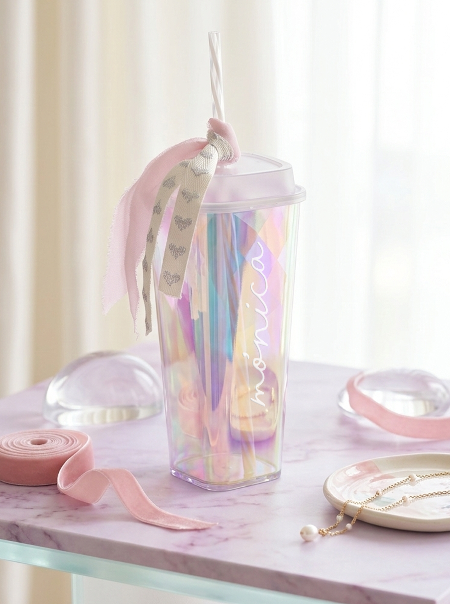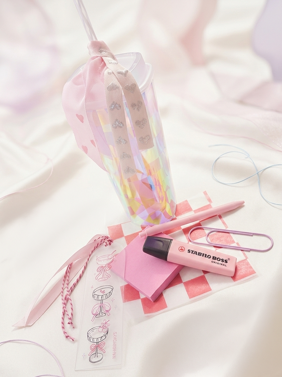 Vaso térmico iridiscente personalizado con tu nombre, relleno con una selección especial de papelería coquette. Incluye Post-it®, marcatextos STABILO BOSS®, clip gigante, pluma rosa y separador ilustrado.