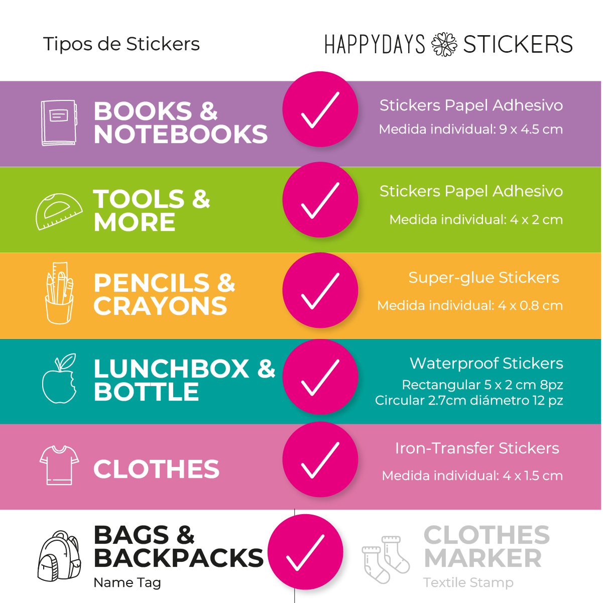 Incluye stickers en papel adhesivo y etiquetas resistentes al agua y al uso rudo (DTF UV y transfer).